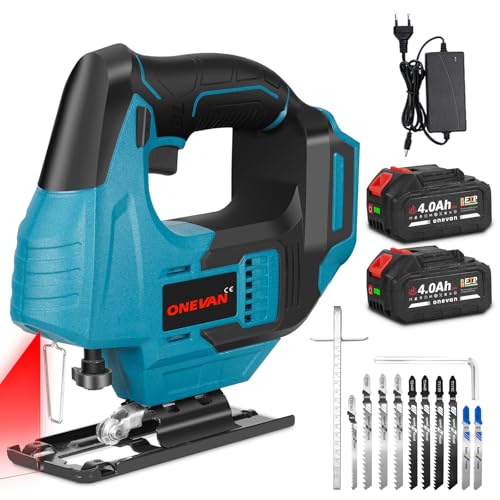 ONEVANジグソーは21Vの充電式電動ジグソーで、無段階変速やブラシレスモーターを搭載。木材55mm、鉄材5mm切断可能。±45°傾斜、内蔵レーザー、LEDライトあり。替刃10本、バッテリー2個、充電器、日本語説明書付き。
