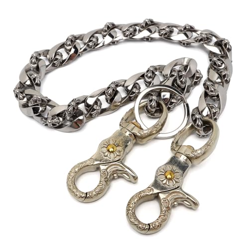 ステンレス製のシルバーウォレットチェーン。幅14mm、全長45cmのダブルクリップ仕様で、重厚感があり盗難防止にも最適。メンズ向けのごつめデザインで、財布をしっかりとサポートします。
