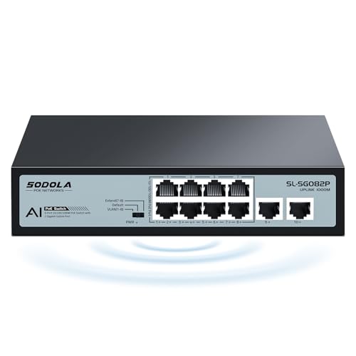 SODOLAの1000Mbps PoEスイッチは10ポート搭載、PoE給電ポート8、アップリンク2、各ポート最大30W、総合120W対応。VLAN対応、ファンレス設計で静音。設置方法はデスクトップまたは壁掛け、プラグアンドプレイで使いやすい。