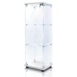 生活グッズラボのショーケースは、幅42.5cm、奥行き36.5cm、高さ125.7cmの3段片扉タイプ(鍵付き)です。ホワイトカラーで、フィギュアやコレクションを収納できる大型キャビネットです。
