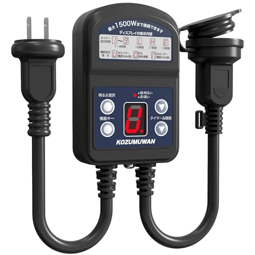 屋外用光センサータイマーコンセント。自動ON/OFF機能搭載、最大1500W対応。設定可能な消灯までの12時間。防雨キャップ付きで耐久性抜群。照明器具、ガーデンライト、イルミネーションに最適。