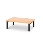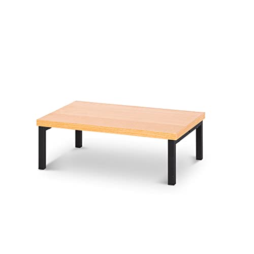 モニター台は木製で木目調、D25xH10xW40cmのサイズ。液晶モニターやノートパソコンの収納に便利。オフィスやテレワークに最適なデスクラック。色はブラウンです。