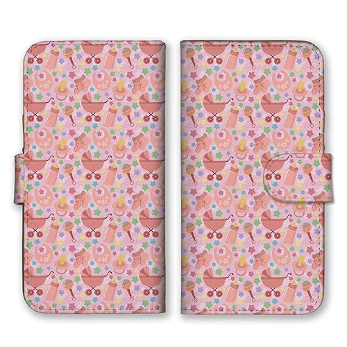 docomo らくらくスマートフォン me F-01L (V) 用の手帳型スマホケース。可愛い星柄とベビーカーをモチーフにしたピンクのデザイン。機能性とおしゃれを兼ね備えた一品。