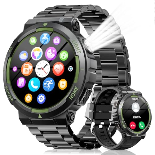 スマートウォッチは軍用規格で、Bluetooth通話やLine通知機能を搭載。GPS連動、100+運動モード、3ATM防水、400mAhバッテリー、音楽&カメラ制御、音声アシスタント機能あり。大画面1.53インチ、iPhone/Android対応(黒と緑)。