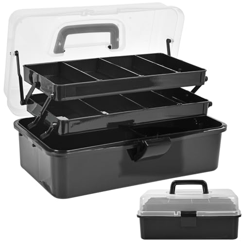 大容量3段式ツールボックスは、半透明デザインで180度オープンが可能。持ち運びに便利な取っ手付きで、家庭や車の小物整理に最適。折りたたみ式で収納も簡単。ブラックカラー。