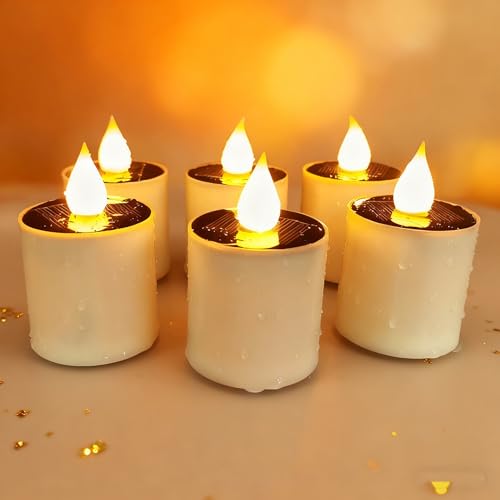 EuroFoneソーラーティーライト6個セットは、防水で太陽光充電可能なLEDキャンドルライト。屋外や室内の装飾に最適で、ちらつきの暖色光が特徴。テラスや庭にぴったりな水滴型デザイン。