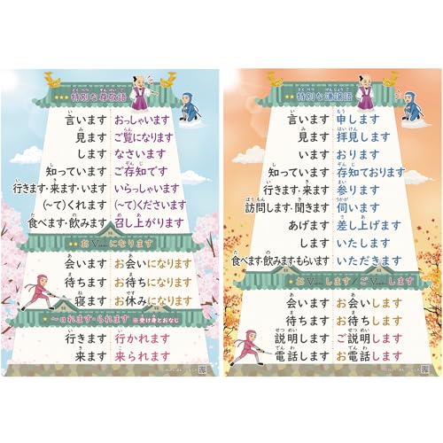 敬語ポスターA1セット『みんなの日本語』は、学習者が日本語の敬語を視覚的に学ぶための教材です。カラフルなデザインで、多様なシチュエーションの敬語表現が掲載されています。教室や自宅での学びをサポートします。