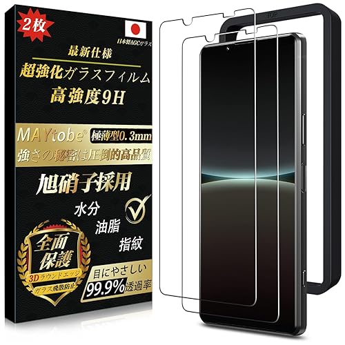 旭硝子製ガラスフィルムはXperia 5 IV対応、硬度9Hの超耐久性を誇ります。99%の高透過率で、飛散防止や指紋防止機能付き。自動吸着で簡単貼り付け可能、ガイド枠付き。