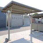ガルバリウム鋼板製サイクルポートは、5台用で間口3290mm、柱間2750mm、奥行2000mmです。ベースプレート式設計で、マンションやアパート、店舗の駐輪場に最適です。型番はSP103YP-Kです。