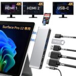 Surface Pro 12用USBハブ。デュアルHDMI出力(4K@60Hz)、USB-C Thunderbolt 4(40Gbps+100W充電)、USB3.0ポート、SD/TFカードリーダー、3.5mmオーディオ搭載。