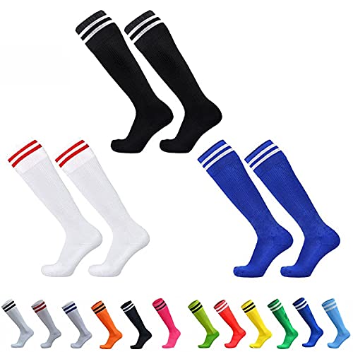 サッカーソックスの3足セットです。キッズから大人まで対応し、ストライプデザイン。滑り止め、通気性、吸汗性に優れ、摩耗に強く速乾性も兼ね備えています。スポーツに最適な男女兼用のロングソックスです。