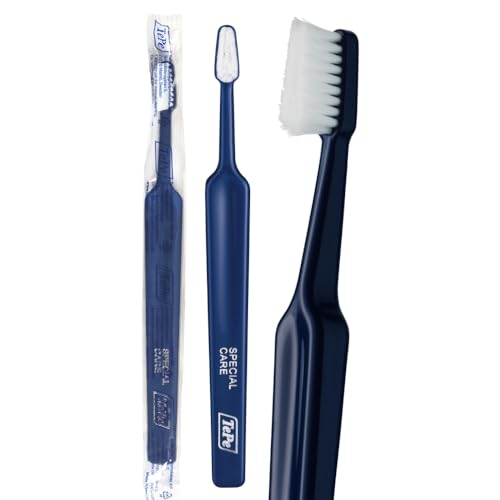 TePeテペのスペシャルケアコンパクト歯ブラシは、やわらかく小さい毛先が特徴で、歯や歯茎に優しく、隙間や奥歯の清掃がしやすい設計です。ブルーのデザインで持ちやすく、毎日の口腔ケアに最適です。