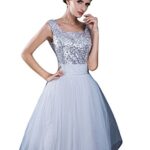 Beauty-Emilyのラインチュールスパンコールスクエアネックショート、ラグジュアリーでミツバーカラーのシルバー。サイズ16。洗練されたデザインが魅力の一着。