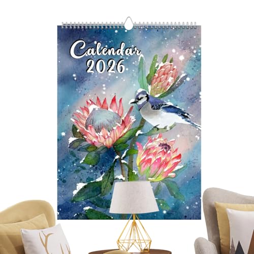 2026年の花と鳥がテーマの壁掛けカレンダー。12ヶ月分の美しいデザインで、リビングやオフィス、寝室のデコレーションに最適な月間プランナーです。