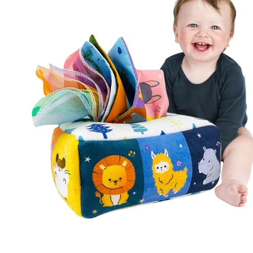 Montessoriスタイルのベビー用ティッシュボックスおもちゃ。赤ちゃんの手指トレーニングや早期教育に最適で、柔らかい素材を使用。無害で安心して遊べるアイテムです。