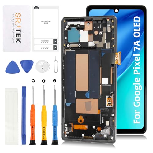 SRJTEKのGoogle Pixel 7A用OLED画面交換キットです。6.1インチサイズで、フレーム付き。指紋ケーブル転送が必要。オリジナルではない液晶スクリーンとタッチデジタイザアセンブリを含みます。