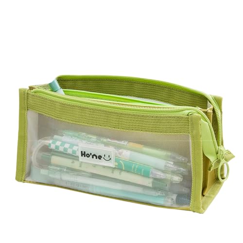 大容量のクリアペンポーチ。メッシュ素材で中身が見やすく、スリムなデザインが特徴。文房具や事務用品の収納に最適で、可愛らしいベージュ色。サイズは10.5*21.4*8cm。