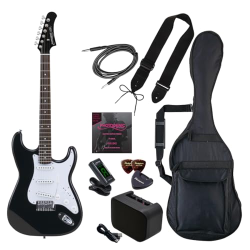 フォトジェニックのSTタイプエレキギター初心者入門セット。ライトセットにはソフトケース、シールド、ミニアンプ、チューナー、ストラップ、ピック、ピックケース、弦、調整用レンチが付属。