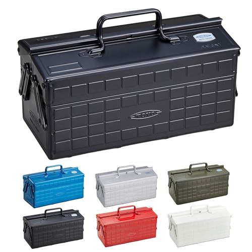 東洋スチールの2段式スチール製工具箱ST-350は、幅約35cm、奥行約16cm、高さ約21cmの日本製ツールボックスです。丈夫なブラックのデザインで、効率的な収納が可能です。