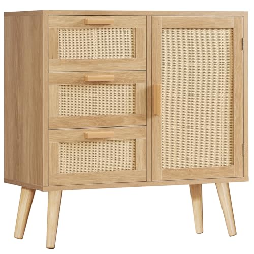 TEENFON サイドボードは、幅80cmの藤編みキャビネットで、3段階の引出しと可動棚が付き、リビング、キッチン、ダイニングルームに最適な木製デザイン。ナチュラルな風合いで、収納力も抜群です。