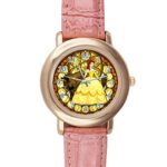 ピンクレザー製のアナログダイヤル腕時計。優雅なデザインで、ディズニーの「美女と野獣」をテーマにしたアイテム。使いやすさとスタイルが両立したコレクション。