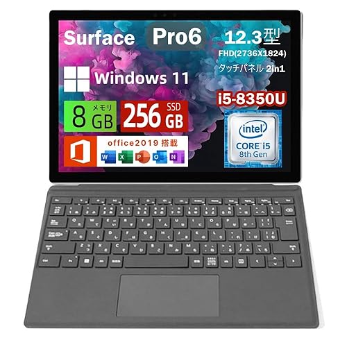 整備済みのSurface Pro 6は、12.3インチタッチパネル (2736×1824)、第8世代Core i5-8350U、8GBメモリ、256GB SSDを搭載。Windows 11とOffice 2019、プラチナの日本語キーボード付きの薄型2in1ノートPCです。