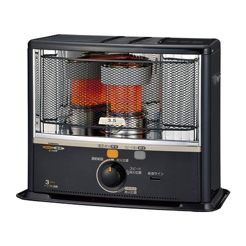 CORONA 石油ストーブは日本製の遠赤ヒーター。木造9畳、コンクリート13畳まで対応。電源不要の防災対策機能付き。タンク容量5Lで、ワンタッチ給油やトリプル消臭機能を搭載したダークグレーのモデル。