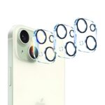 3枚セットのiPhone 15 / 15 Plus用カメラレンズ保護フィルムです。強化ガラス製、全面保護で黒縁取り。露出オーバーを防ぎ、カメラをしっかり守ります。