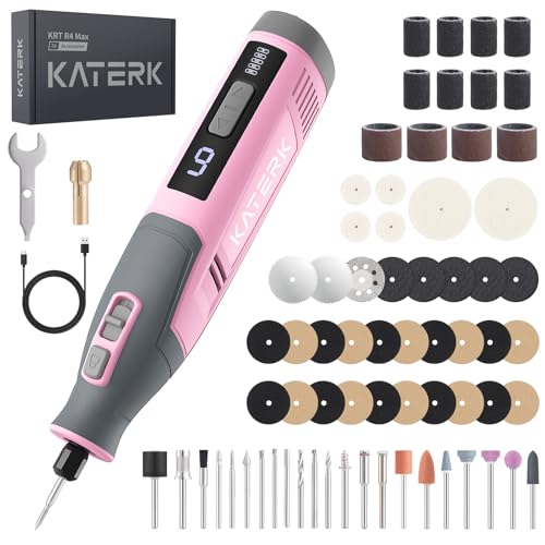 Katerkのミニルーターは28000RPMで6段階の変速が可能。コードレス、4V Type-C充電式で、70点のアクセサリーセット付き。木工や研磨、彫刻、穴あけなど多用途対応のコンパクトな電動工具です。