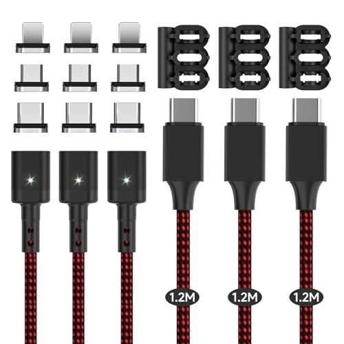 SUNTAIHOのUSB-Cマグネット充電ケーブルは、3Aの急速充電に対応し、1.2mの長さで3本入り。9個の磁気端子を備え、Type-C、MicroUSB、USB-B対応。赤黒色でLED付き、防塵・着脱式のデザインです。