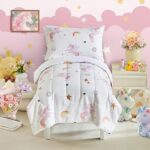 ユニコーンデザインのピンクの4ピース幼児用寝具セット。ソフトな材質で、レインボーや花モチーフが可愛らしく、プリンセスの夢を演出。シーツと枕カバー付きで、バッグに収納可能。