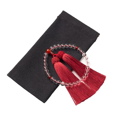 本水晶で作られた女性用数珠。36玉の手作り念珠は葬儀・墓参り・法事に適し、全ての宗派で使用可能。主珠は透明水晶、房色はボルドー色です。