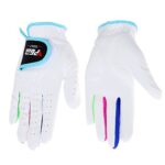子供用ゴルフグローブ、両手用。全天候対応の柔らかい繊維布製。ホワイトカラーで、快適なフィット感が特徴。初心者から経験者まで、幅広く使用可能。
