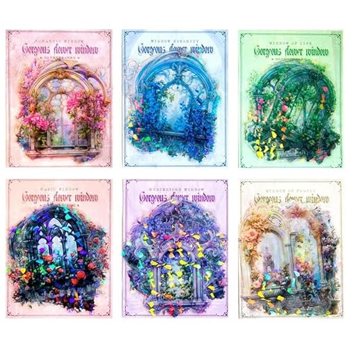 大きめのクリアシール、箔押しデザインの貝シェル光と花柄。透明で耐水性、手帳やDIYデコ向け。ウインドウフレームやガーデンの装飾に最適。
