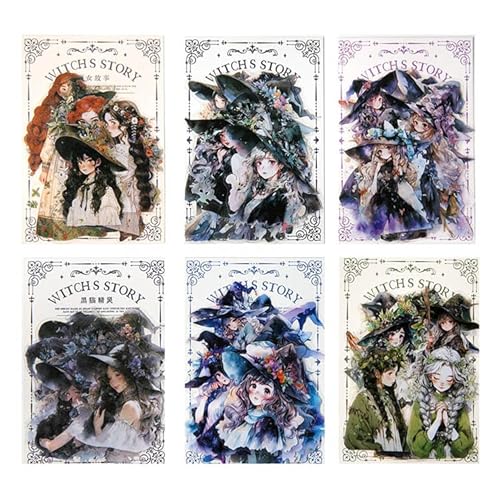 大きめサイズの魔女イラストステッカー。可愛い少女と黒猫、魔女の要素を取り入れたデザイン。耐水性PET素材で、デコレーションやハンドメイドに最適。コラージュにぴったりのアイテムです。