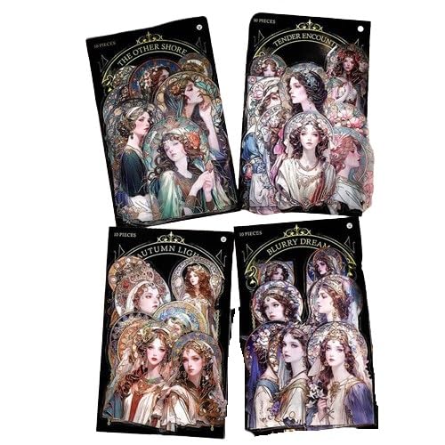 オーロラ金箔押しのクリアシール。大きめの神秘的な人物シールで、海外の女性や少女の全身を描いたアートイラスト。耐水・防水で、デコレーションやコラージュ素材に最適。
