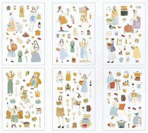 EiEi 型抜き カット済 6枚入り 四季の暮らしシリーズ PET 人物 女の子 少女 服 ファッション 生活雑貨 花柄 イラスト クリアシール かわいい 雑貨 日常生活 コラージュ素材 フレークシール 手帳 日記シール sztz-06-070-3 3.秋葉