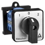 Heschenのユニバーサルロータリーカムセレクター切替スイッチ(SZW26-20/D303.3-B11R)。35mm DINレールマウント、660V 20A、3ポジション、3フェーズ、12ターミナル、CE/TUV規格準拠。