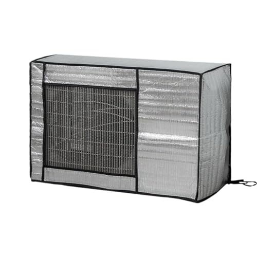夏季用屋外ユニット保護カバー、雨や日差しからエアコン室外機を守る。多サイズ対応、アルミ製で軽量。固定用ベルト付きで安心設置。