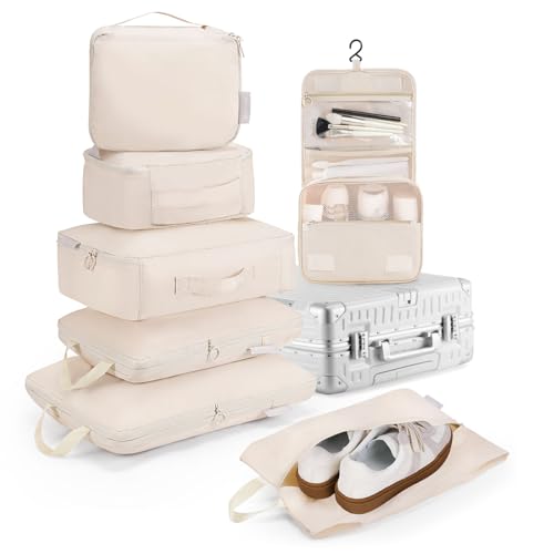 トラベルポーチ圧縮7点セットは旅行用に最適。スペースを40%節約でき、軽量で丈夫なファスナー付き。スーツケースの仕分けが簡単になり、出張や旅行に便利なアイテムです。ベージュ色でおしゃれ。