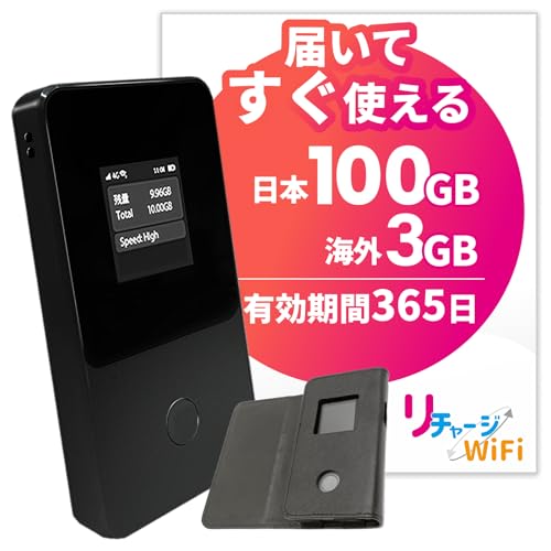 リチャージWiFiは、ロングバッテリーで100GB+のデータを1年間利用可能な小型ポケットWiFiです。契約返却不要で、国内外利用が簡単。電源ONで即時接続、専用ケース付き。