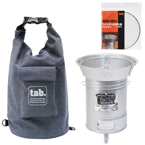 缶ストーブEX&ワイドグリルSE、スリムバッグ、替え網2枚の4点セットです。二次燃焼機能付きで、焚き火台や薪ストーブとして活用できます。キャンプやBBQに最適なデニムバッグ付き。