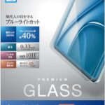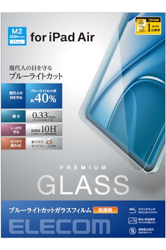 エレコムのiPad Air 11インチ用ガラスフィルム。強化ガラス製で指紋防止、ブルーライトカット機能。貼りやすく、貼り直し可能。2024/2025年モデル対応。ガイド枠付き。