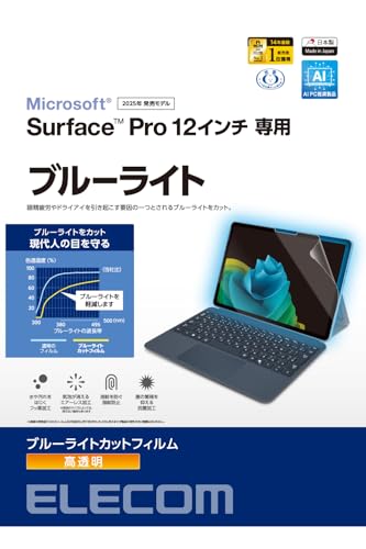 エレコム Surface Pro用光沢保護フィルム。12インチ対応、ブルーライトカット機能付き。気泡が目立ちにくい特殊吸着で、貼りやすく再剥離可能。型番:TB-MSP25FLBLGN。