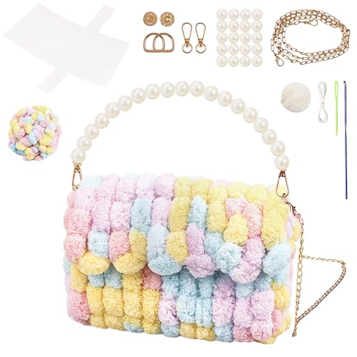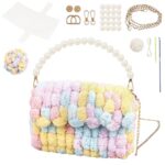 編み物のバッグ手作りキット。ハンドメイドで作るかわいいDIYバッグ。毛糸ポンポンとセットで、子供から大人まで楽しめる人気の手芸キット。誕生日プレゼントにも最適!(ピンク)