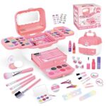 Bobblyfunの子供用メイクセットは、ピンクのユニコーンテーマで、3歳から10歳までの女の子に最適。アイシャドウ、リップスティック、ネイルポリッシュなどが含まれ、すべて水で落ちます。可愛い収納ボックスとブラシスタンド付き。