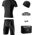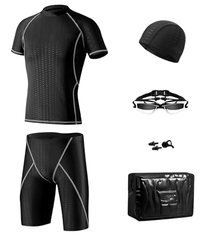 TEABAKU メンズフィットネス水着6点セット。競泳用ラッシュガード、スイムキャップ、ゴーグル、ノーズクリップ、耳栓、スイムバック付。サイズ4XL、グレーのステッチでスタイリッシュ!