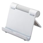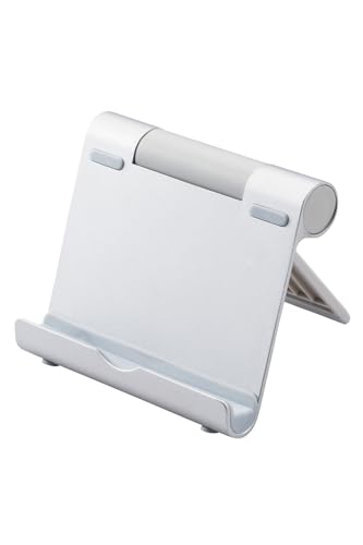 エレコムのタブレットとスマホスタンドは、4.6~12.9インチ対応で10段階の角度調節が可能。折り畳み時は厚さ約2cmで軽量、持ち運びにも便利。iPhone、iPad、Switchなどに対応したシルバー色です。