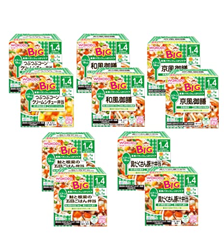 ベビーフードのBIGサイズ、栄養マルシェの離乳食バラエティセット。1歳4か月頃から、5種類×2個、計10個入り。食べ比べに最適で、オリジナルポケットティッシュ付き。