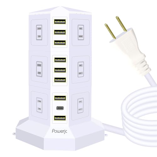 JIACHANタワー式電源タップは、12ACコンセントと9USBポート、USB C PDによる高速充電に対応。雷ガードと過負荷保護機能があり、オフィスや家庭の省エネに最適。PSE認証済みの白色デザイン。